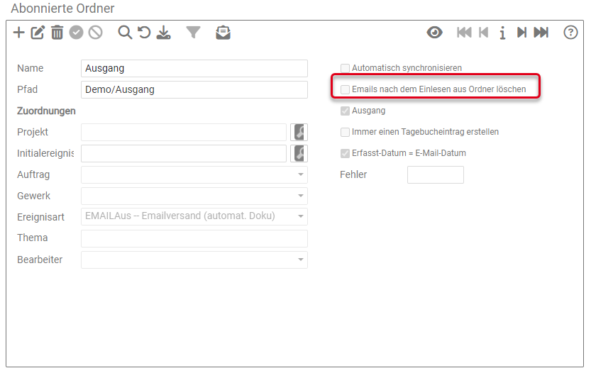 Der Ordner wird regelmäßig und automatisch vom Server abgeholt und die E-Mails eingelesen, alle Ordner die nicht Automatisch eingelesen werden müssen Manuell eingelesen werden.